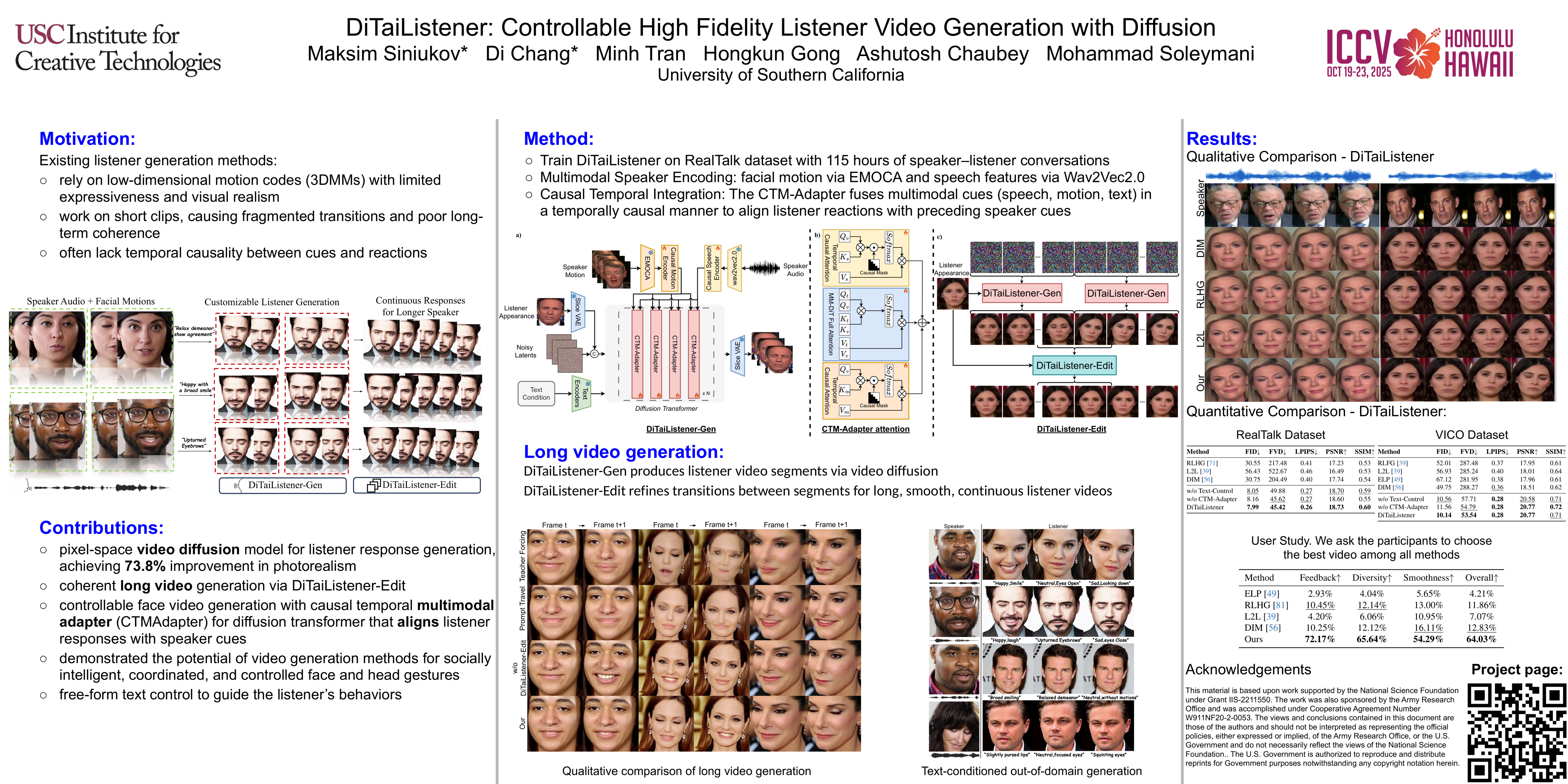 Generating naturalistic and nuanced listener motions for extended interactions remains an open problem.Existing methods often rely on low-dimensional motion codes for facial behavior generation followed by photorealistic rendering, limiting both visual fidelity and expressive richness.To address these challenges, we introduce DiTaiListener, powered by a video diffusion model with multimodal conditions. Our approach first generates short segments of listener responses conditioned on the speaker's speech and facial motions with DiTaiListener-Gen. It then refines the transitional frames via DiTaiListener-Edit for a seamless transition. Specifically, DiTaiListener-Gen adapts a Diffusion Transformer (DiT) for the task of listener head portrait generation by introducing a Causal Temporal Multimodal Adapter (CTM-Adapter) to process speakers' auditory and visual cues. CTM-Adapter integrates speakers' input in a causal manner into the video generation process to ensure temporally coherent listener responses. For long-form video generation, we introduce DiTaiListener-Edit, a transition refinement video-to-video diffusion model. The model fuses video segments into smooth and continuous videos, ensuring temporal consistency in facial expressions and image quality when merging short video segments produced by DiTaiListener-Gen.Quantitatively, DiTaiListener achieves the state-of-the-art performance on benchmark datasets in both photorealism (+73.8\% in FID on RealTalk) and motion representation (+6.1\% in FD metric on VICO) spaces.User studies confirm the superior performance of DiTaiListener, with the model being the clear preference in terms of feedback, diversity, and smoothness, outperforming competitors by a significant margin.