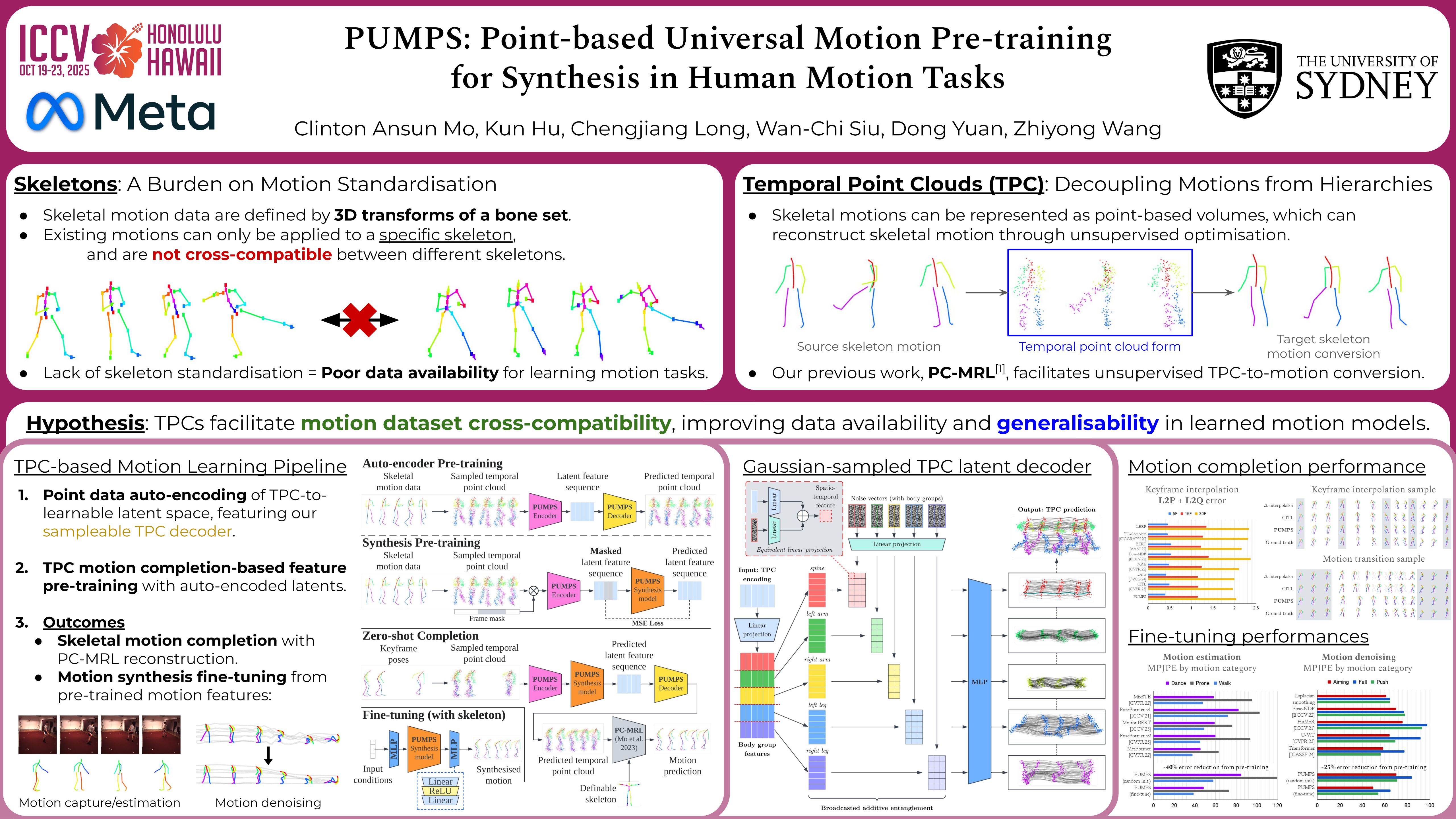 The motion skeleton is a core data structure of 3D animation workflows, producing character motions by posing a pre-defined bone hierarchy. Motion data is largely incompatible across skeletons with proportional and/or hierarchical differences, raising long-standing challenges for data-driven motion synthesis. To address this, Temporal Point Clouds (TPC) have emerged as a universal, cross-compatible motion representation, using temporally consistent points that map motion trajectories. While TPCs have demonstrated reversibility with skeletal motions, their role is currently limited to enabling cross-compatibility, whereas we believe motion tasks can be learned directly in the TPC medium. This would require TPC motion synthesis capabilities, which is an unexplored field due to its unique temporal consistency and point identity requirements.In this paper, we propose PUMPS, the primordial auto-encoder architecture for TPC data. It reduces point cloud frames independently into sampleable feature vectors, from which a decoder efficiently extracts distinct temporal points using latent Gaussian noise vectors as sampling identifiers. We introduce linear assignment-based point pairing to optimise the TPC reconstruction process without requiring expensive point-wise attention mechanisms in the architecture. Using the auto-encoder, we produce a pre-trained motion synthesis model capable of performing motion prediction, transition generation, and keyframe interpolation tasks. PUMPS performs remarkably well even without native dataset supervision, matching state-of-the-art performance in its pre-training tasks, and outperforming existing methods when fine-tuned for skeletal motion denoising and estimation tasks.