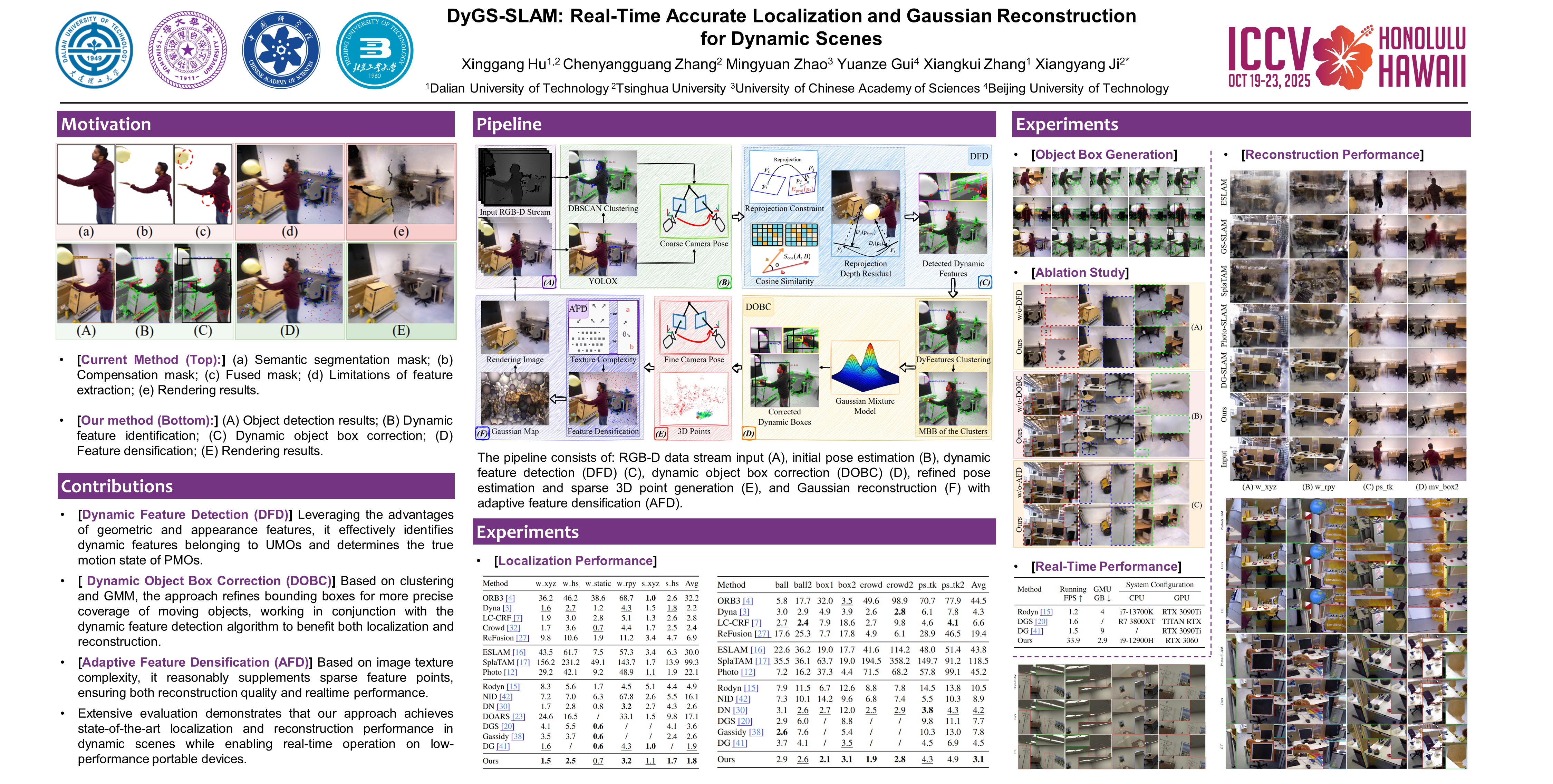 In dynamic scenes, achieving accurate camera localization and reconstructing a long-term consistent map containing only the static background are two major challenges faced by Visual Simultaneous Localization and Mapping (VSLAM). In current traditional dynamic VSLAM systems, the methods used to handle dynamic objects are primarily designed for localization; if applied to reconstruction, they are prone to introducing motion artifacts. Meanwhile, mask compensation strategies in NeRF- or 3DGS-based dynamic VSLAM systems also face challenges, such as the inability to completely eliminate dynamic object artifacts and low real-time performance. To address these issues, we leverage object detection to extract semantic information and propose a dynamic feature detection algorithm based on both geometry and appearance. This algorithm accurately identifies known and unknown moving objects and determines their actual motion states. To mitigate the issue of insufficient detection box coverage, we design a dynamic object box correction algorithm based on clustering and Gaussian mixture models to comprehensively identify moving object regions. Furthermore, to overcome the limitations of sparse features in texture-scarce environments, we introduce a feature densification strategy based on image texture complexity, enhancing reconstruction quality while maintaining real-time performance. Extensive experimental evaluations demonstrate that our system achieves state-of-the-art localization and reconstruction performance in dynamic scenes and can run in real time on resource-constrained devices.