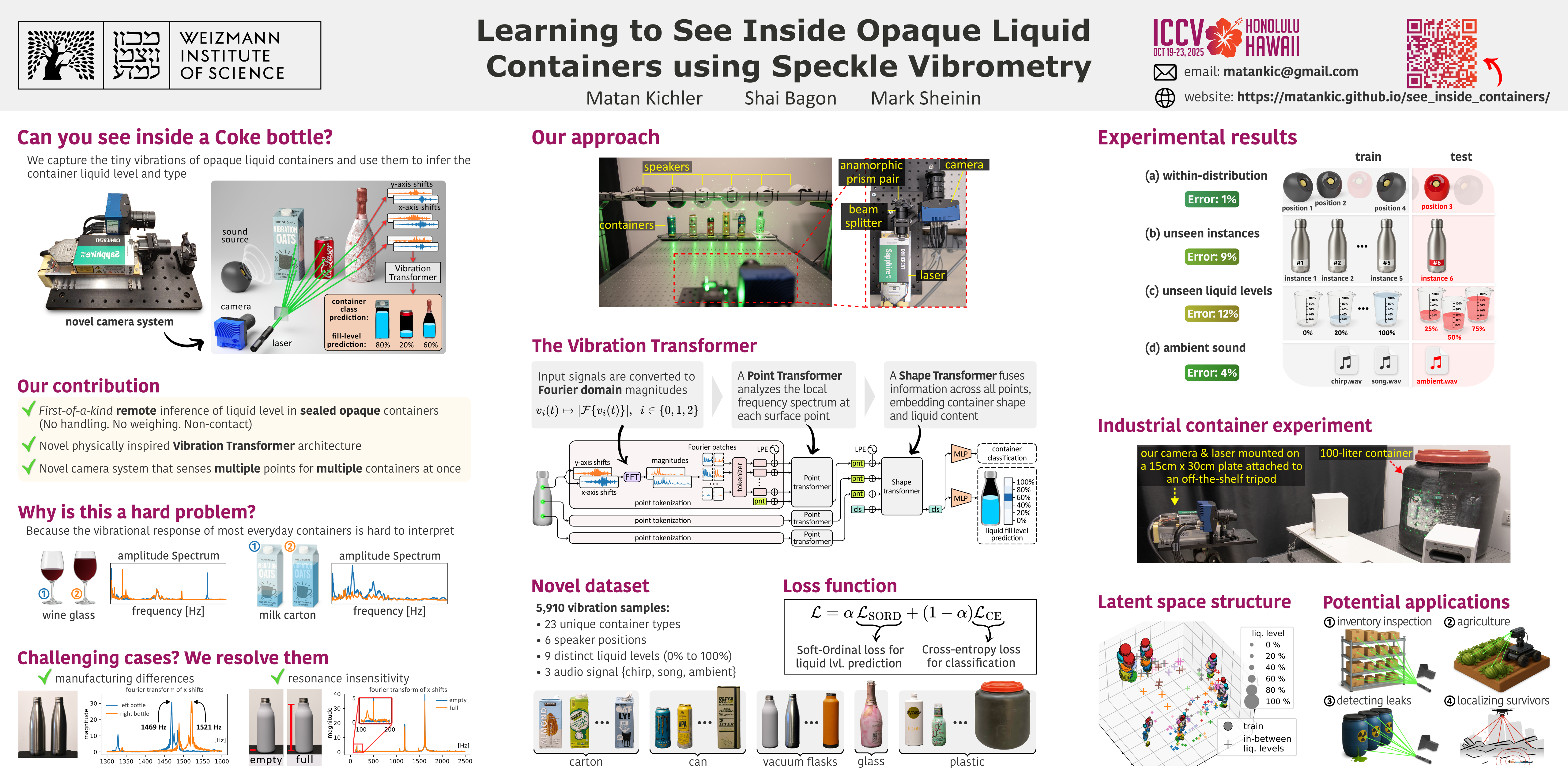Computer vision seeks to infer a wide range of information about scene objects and events. However, vision systems based on conventional imaging are limited to extracting information only from the visible surfaces of scene objects. For instance, a vision system can detect and identify a Coke can in the scene but cannot determine whether it is full or empty. In this paper, we seek to extend the scope of computer vision to include the novel task of inferring the hidden liquid levels of opaque containers by sensing the tiny vibrations on their surfaces. First, we propose a novel speckle-based vibration sensing system for capturing scene vibrations on a 2D grid of points, at once. We use our system to efficiently and remotely capture a dataset of vibration responses for a plurality of everyday liquid containers. Then, we develop a transformer-based approach for analyzing the captured vibrations and classifying the container type and its hidden liquid level at measurement time. Our architecture is invariant to the vibration source, yielding correct liquid level estimates for controlled and ambient scene sound sources. Moreover, we show that the model can generalize to unseen container instances and fluid levels. We demonstrate our method by recovering liquid levels from various commonplace containers. Code and data will be made publicly available upon acceptance.